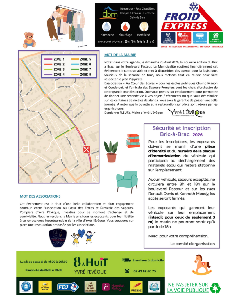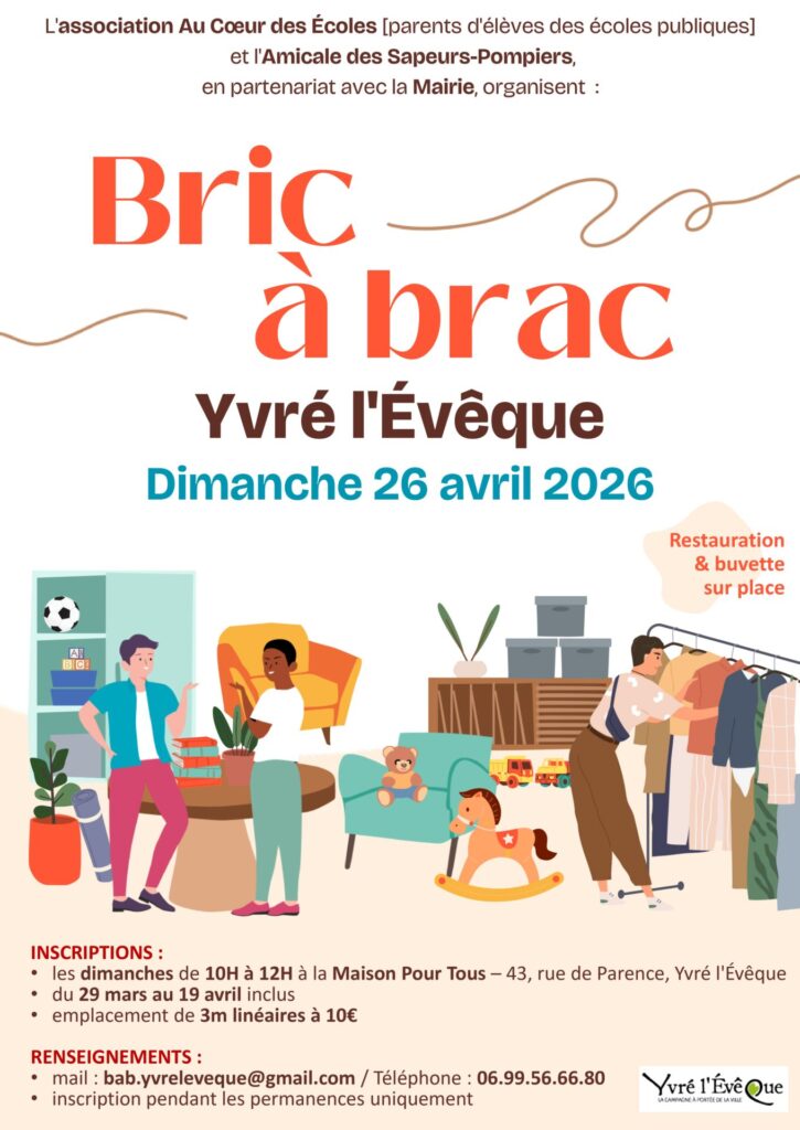 L’association Au Cœur des Ecoles [parents d’élèves des écoles publiques) et l’Amicale des Sapeurs-Pompiers, en partenariat avec la Mairie, organisent l’annuel Bric à Brac d’Yvré l’Evêque