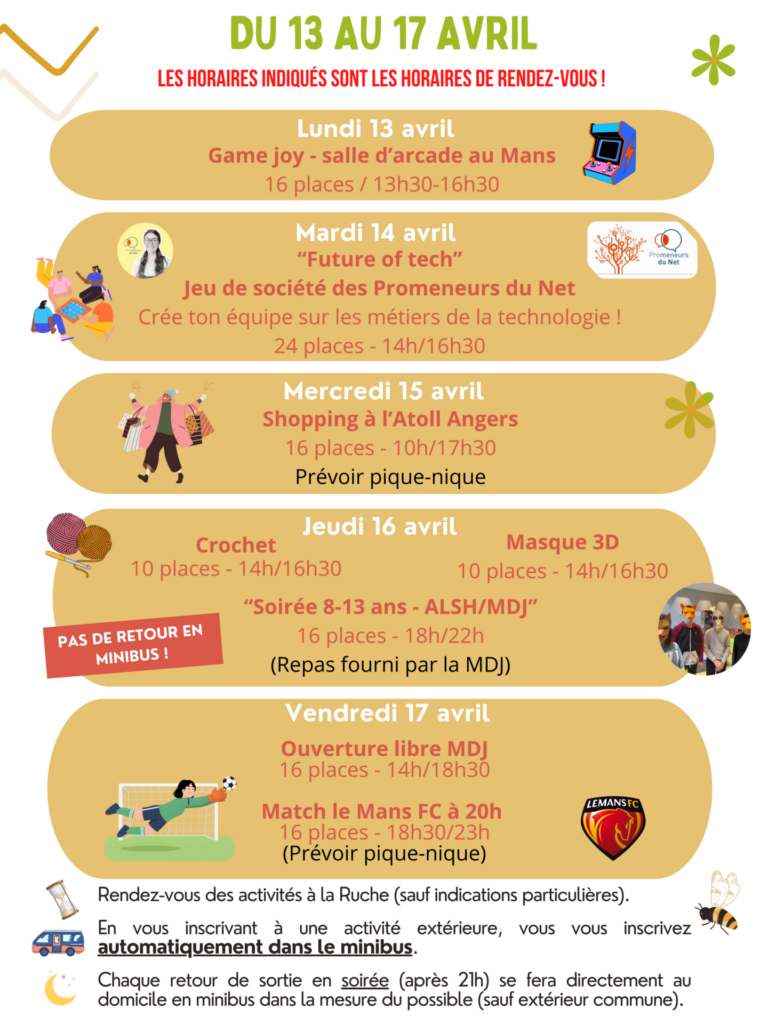 Publication publiée :30 mars 2026 Post category:Actualités Du 13 au 24 avril 2026, inscription sur l’Espace famille à partir du lundi 30 mars à 18h30 Vous devriez également aimer Prévention – Obligations légales de débroussaillement 2 février 2026 Coupure de courant pour travaux 3 mars 2026 Saison culturelle 2025 – 2026 18 août 2025